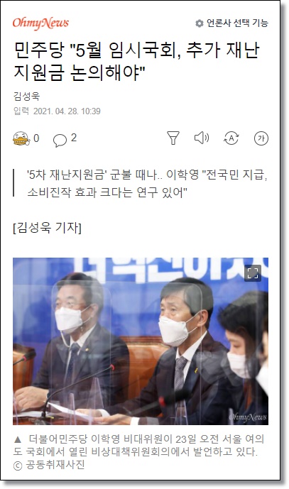 오마이뉴스(4월 28일자)는 더불어민주당 지도부가 5월 임시국회를 통하여 전 국민 재난지원금과 관련된 논의를 해야 한다는 관련 보도기사를 냈다.