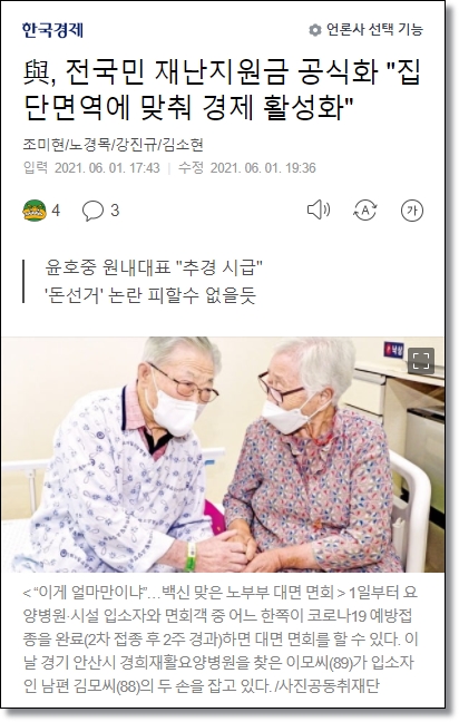 한국경제는 여당인 더불어민주당이 전 국민 재난지원금 지급을 사실상 공식화했다고 6월 1일에 보도하였다. 윤호중 민주당 원내대표가 원내대책회의에서 "전 국민 재난지원금을 포함한 추가경정예산안의 편성과 처리가 시급하다"고 밝혔다.