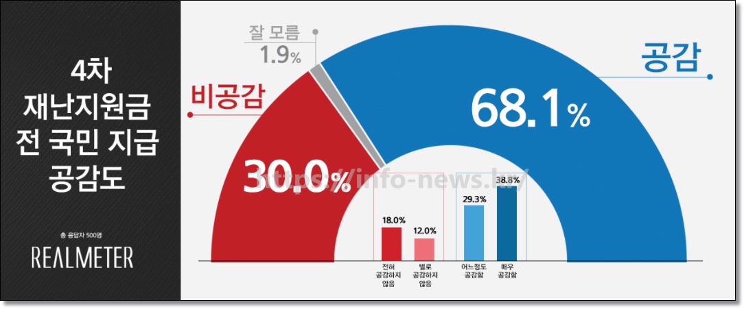 재난지원금의 보편 지급과 관련된 여론은 언제나 우세했다. 특히 지난 1월 7일 여론조사 전문기관 리얼미터는 설문조사를 통하여 '4차 재난지원금 전 국민 지급 공감도' 내용을 발표하기도 하였다.