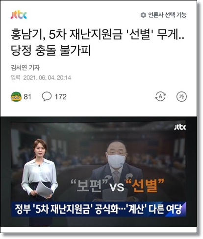 정부도 5차 재난지원금을 공식화 했지만, 홍남기 경제부총리 겸 기획재정부 장관은 "소상공인 등 코로나 위기에 따른 취약 및 피해계층 지원대책 등이 그 중심이 될 것"이라 밝히며, 여당의 '보편지급'과 정부의 '선별지급' 충돌이 예상되었다. [출처 : JTBC]