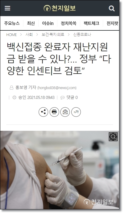 이외에도 5차 재난지원금을 백신 접종을 맞는 조건으로 지원해야 한다는 내용도 거론되고 있다. 천지일보 기사(5월 18일자)에 따르면 정부가 11월까지 집단면역 형성을 목표로 코로나19 백신 접종을 진행 중인 가운데, 접종률을 높이기 위하여 재난지원금 등의 인센티브 관련 논의를 진행중이다.