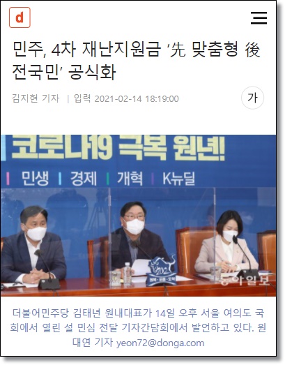 특히 지난 2월 14일 동아일보 기사(2월 14일자)에 따르면, 3월 안으로 자영업자와 소상공인 등을 위한 맞춤형 지원부터 한 뒤에 확진자 추이를 지켜보면서 소비 활성화를 위한 '전국민 보편 지급'을 추진하겠다고 밝힌 바 있다.