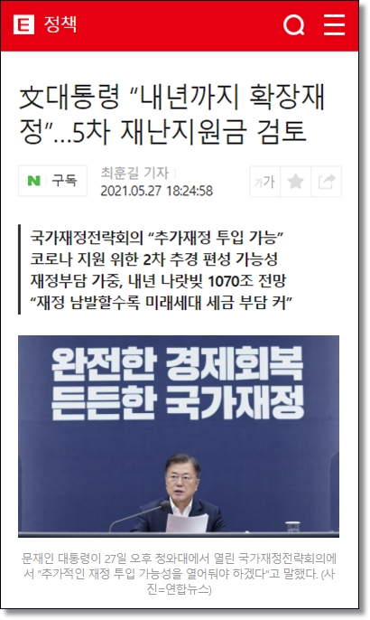 이데일리는 지난 5월 27일 청와대에서 열린 '2021 국가재정정략회의'에서 문재인 대통령이 "적어도 내년까지는 경기의 확실한 반등과 코로나 격차 해소를 위해 확장재정 기조를 유지할 필요가 있다"고 말한 것을 두고 2차 추경 편성을 시사했다고 보도하였다.