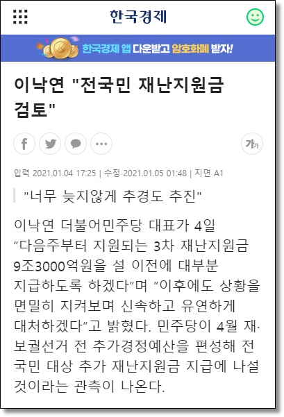 이낙연 더불어민주당 의원은 당 대표로 있을 때, 4차 재난지원금은 전 국민 지급을 하겠다는 입장을 여러 번 나타냈었다. 지난 한국경제 기사(1월 4일자)에서는 4월에 전 국민 대상 추가 재난지원금 지급에 나설 것이라는 관측을 내놓기도 하였다.