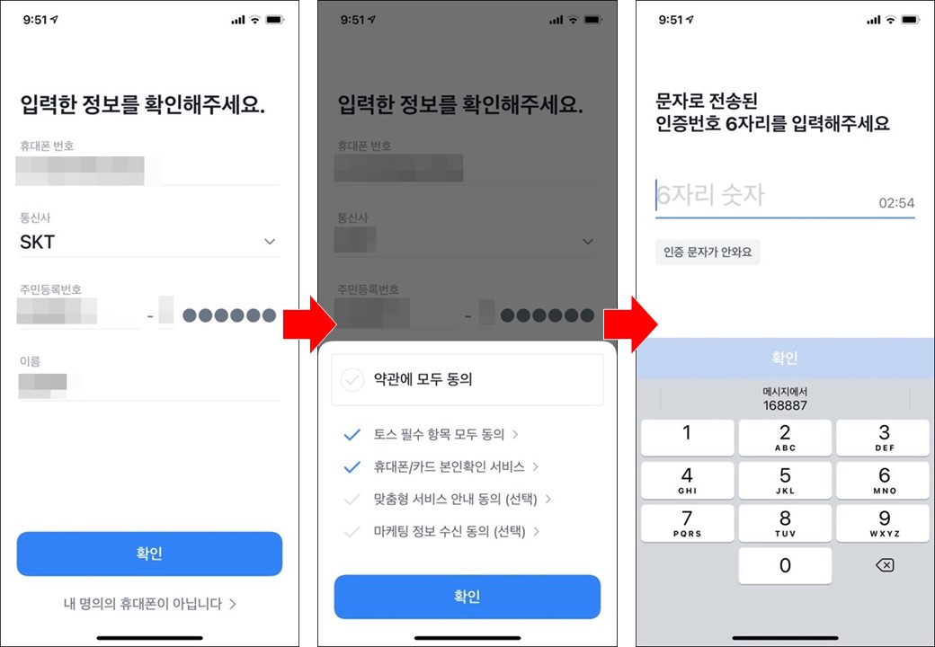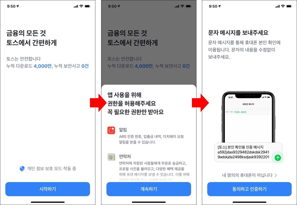 먼저 토스앱을 실행하여 시작하기를 누른 다음에 앱 사용 권한을 허용한 뒤, 문자메시지를 보내서 본인 인증 절차를 밟는다.