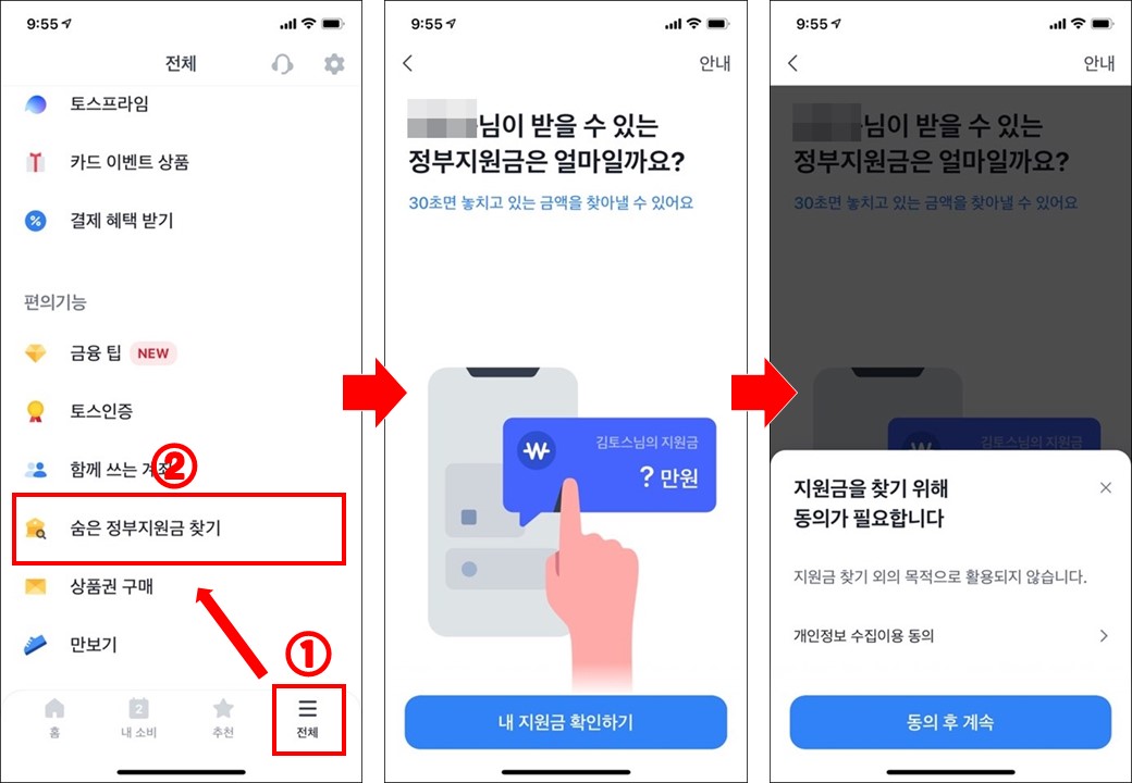 오른쪽 아래 ①'전체' 메뉴를 누른 뒤에 ②'숨은 정부지원금 찾기'를 누릅니다. 그리고 '내 지원금 확인하기', '동의 후 계속'을 눌러준다.