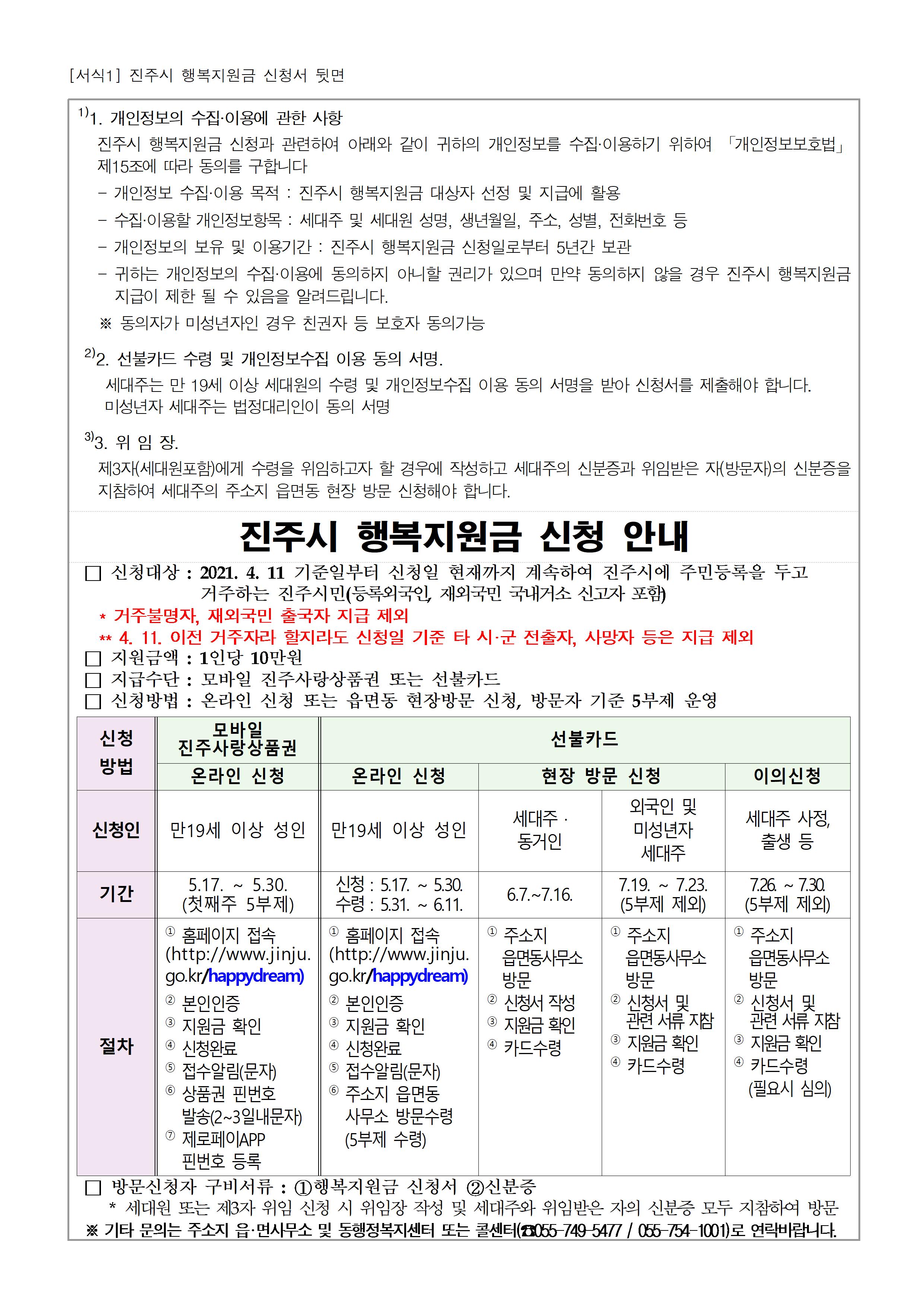 - 2021. 4. 11. 기준일 이전부터 신청일 현재까지 계속하여 진주시에 주민등록을 두고 거주하는 진주 시민